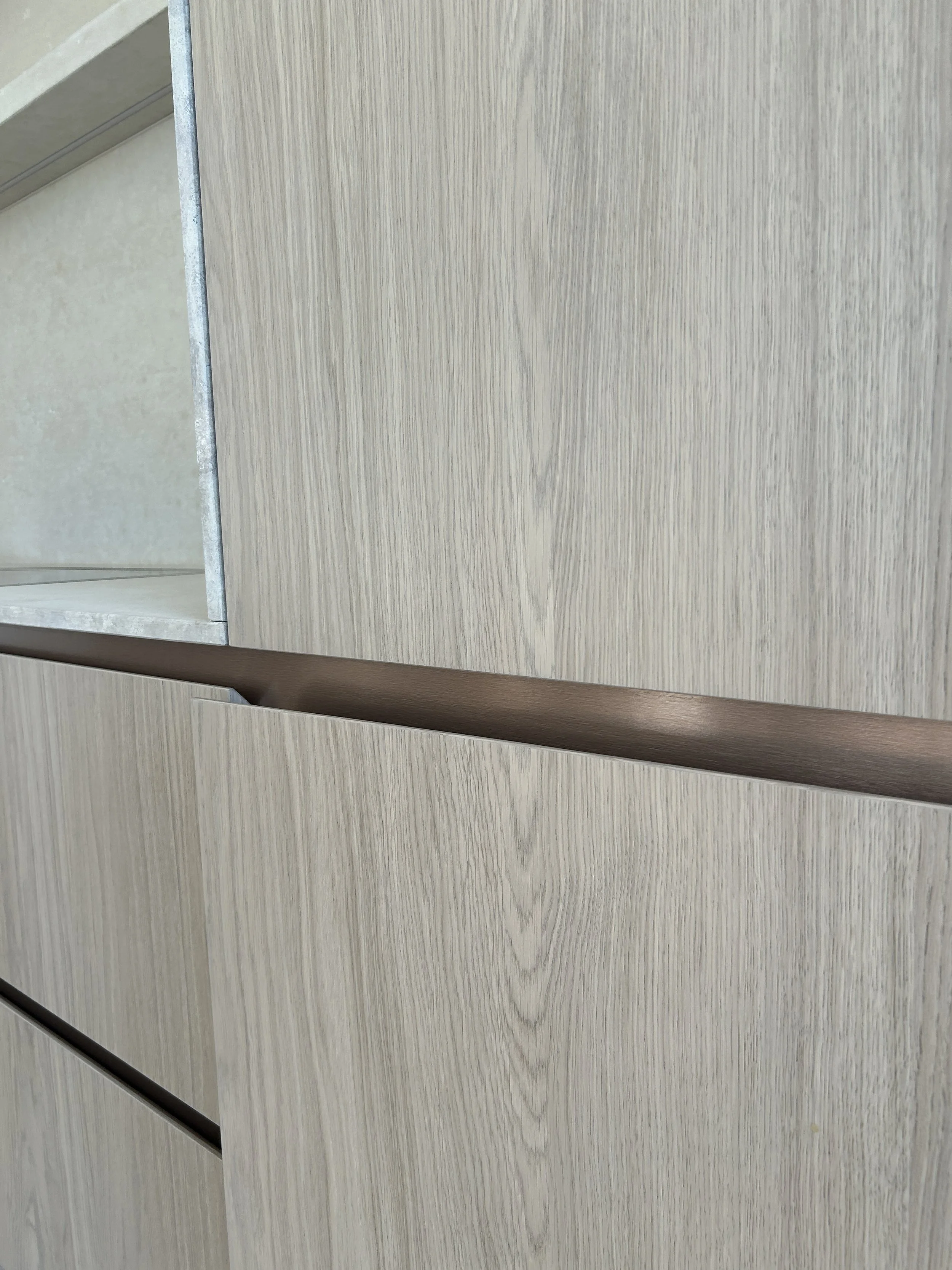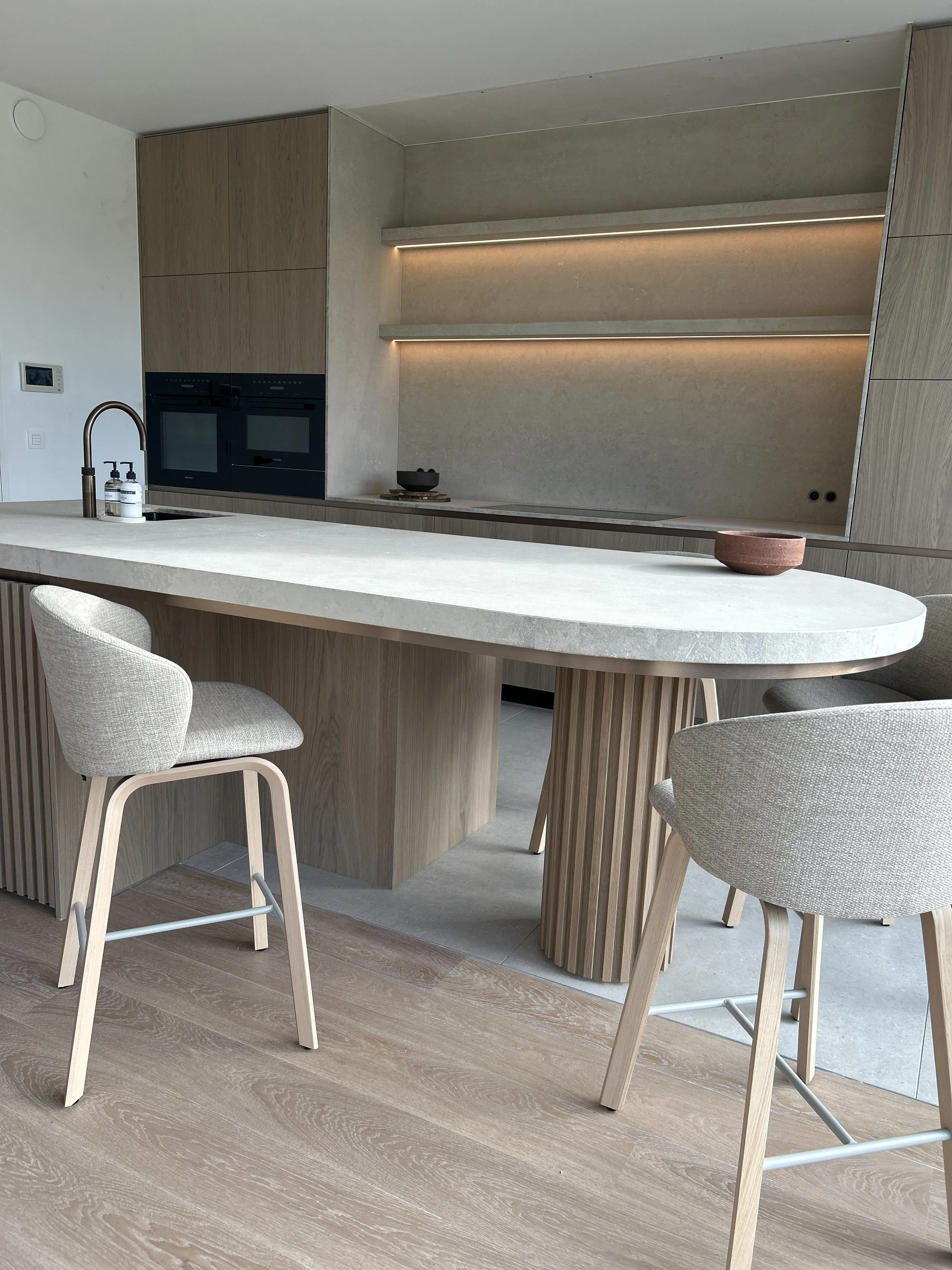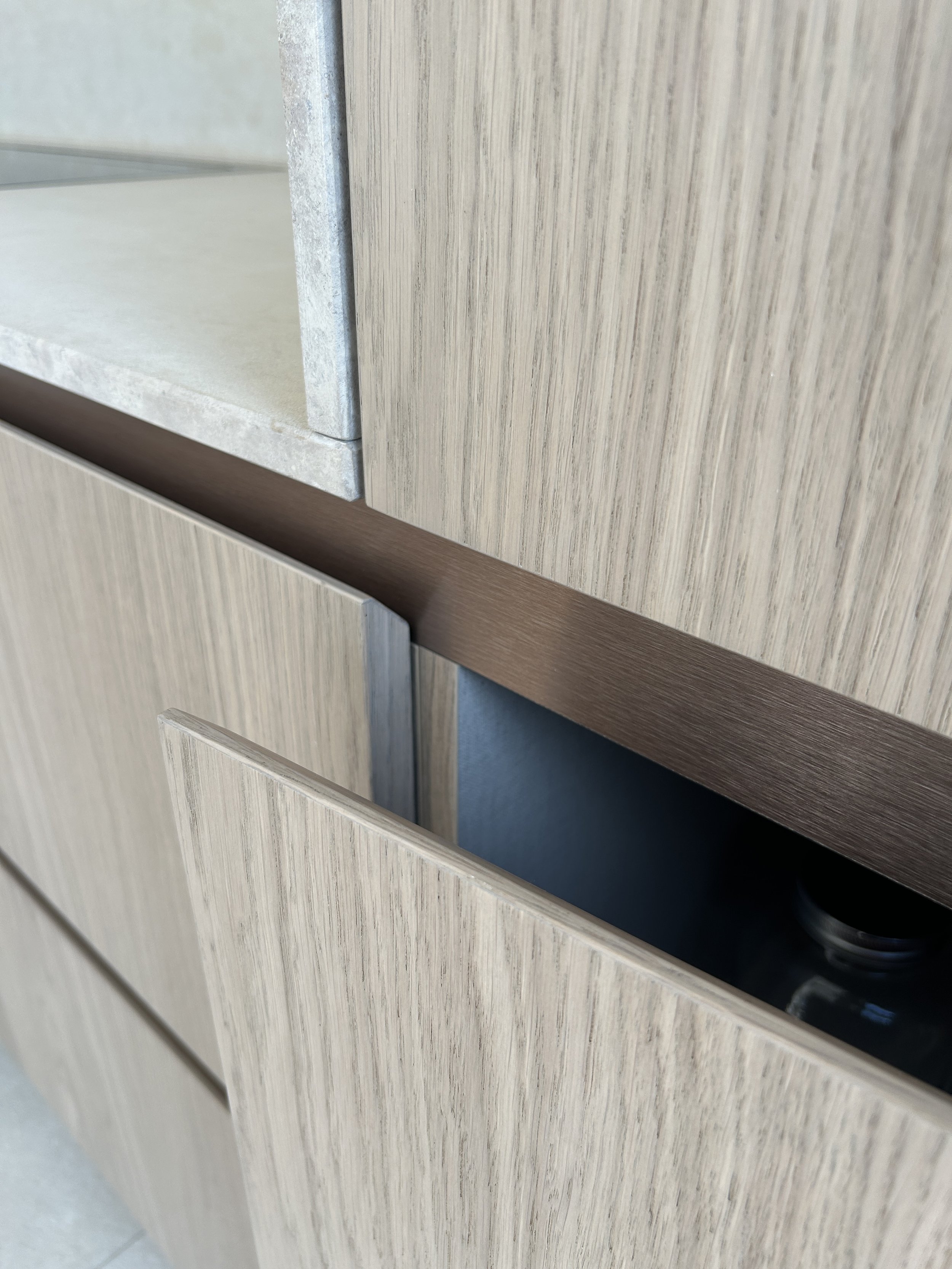 Lia concept koos voor een interieur waarin natuurlijke materialen centraal staan — materialen die zowel warmte als elegantie brengen. De combinatie van houten fineer en Travertin illustreert die balans perfect.