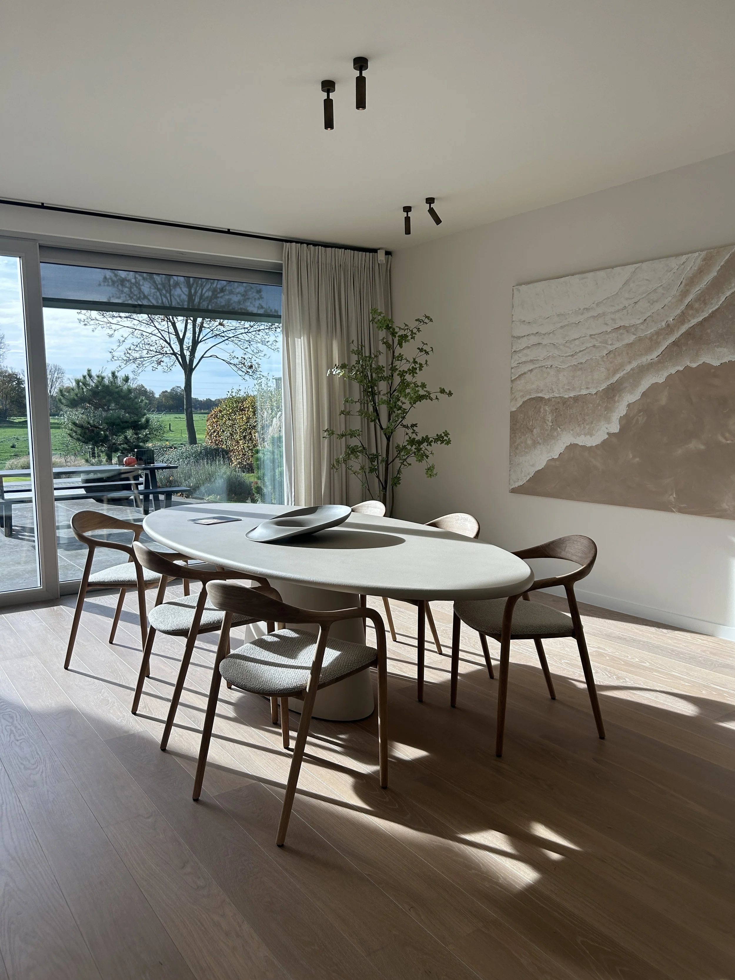 De bewoners stelden van in het begin dat het gelijkvloers van hun villa — gesitueerd midden in het groen — onder alle omstandigheden rust moest uitstralen. Tegelijk wilden ze dat die rust niet ouderwets of statisch aanvoelde, maar eerder op een eigentijdse, vernieuwende manier tot uiting kwam.