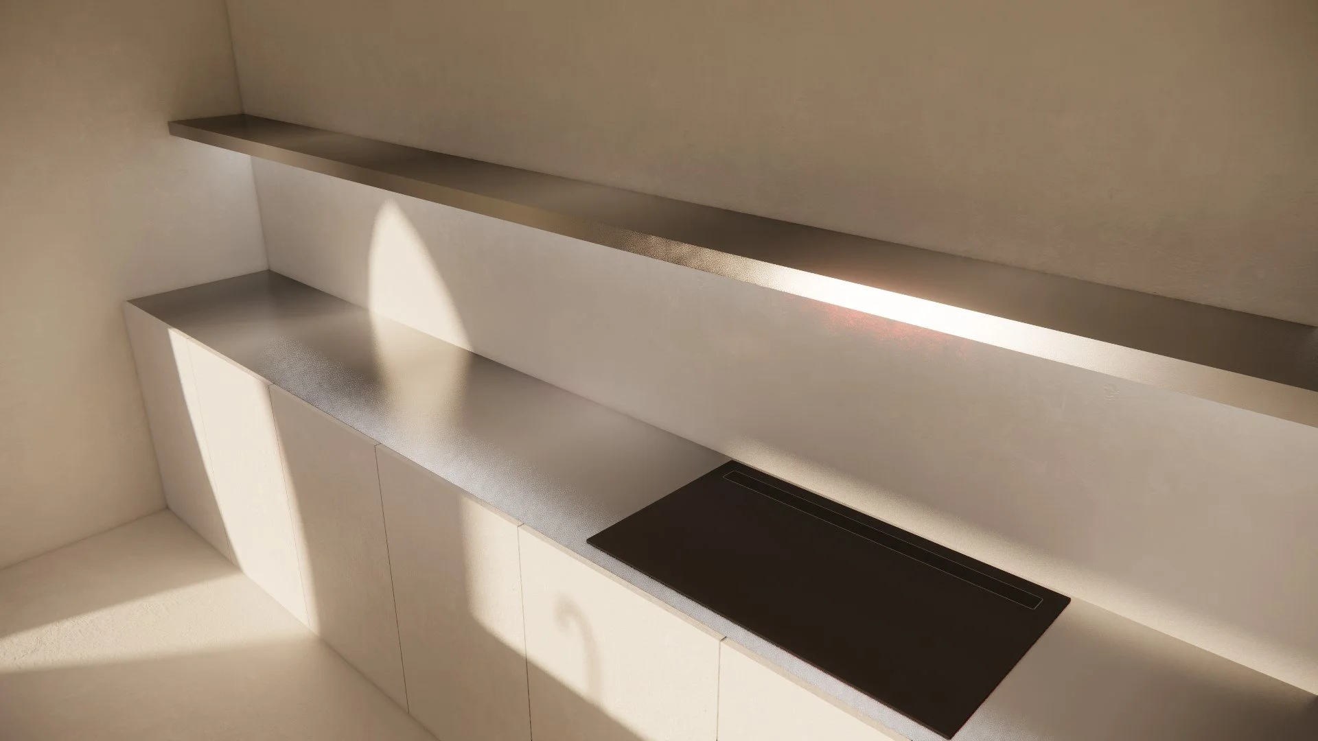 De kookplaat is voorzien van een downdraft dampkap waardoor er kon gewerkt worden met een doorlopende RVS legger met geïntegreerde led-verlichting boven het aanrecht.